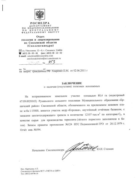 На испрашиваемом земельном участке площадью 80,4 га (кадастровый 67:09:0020103 ) Руханьского сельского поселения Муниципального образования "Ершичский район" Смоленской области, обозначенного на прилагаемом межевом плане м-ба 1:15000, имеется участок недр "Корсики", неучтенный отчетным балансом, с запасами цеолитсодержащего трепела в количестве 12107 тыс.м3 по категории С2, в качестве сырья для производства термолита ( легкого пористого заполнителя в бетон).Запасы приняты протоколом №124 НТС Подмосковной ГРЭ от 20.12.1979 г.