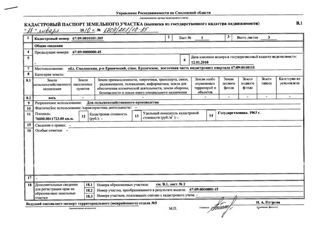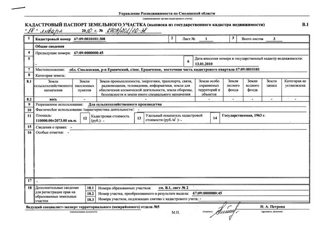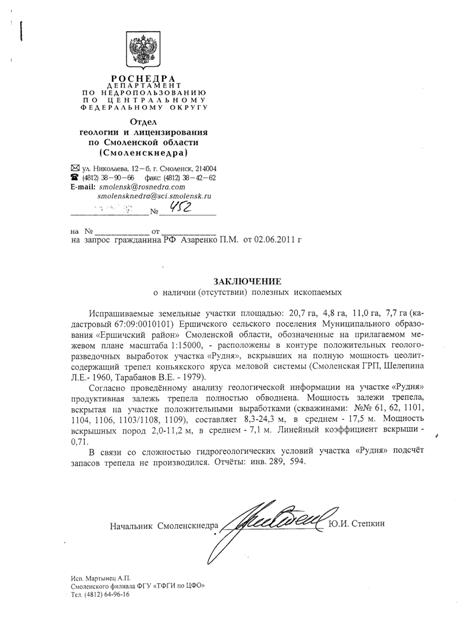 Испрашиваемые земельные участки площадью: 20,7 га, 4,8 га, 11,0 га, 7,7 га (кадастровый 67:09:0010101) Ершичского селького поселения Муниципального образования "Ершичский район" Смоленской области - расположенны в контуре положительных геологоразведочных выработок участка "Рудня", вскрывших на полную мощность цеолитсодержащий трепел коньякского яруса меловой системы.