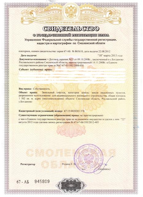 Участок оформлен в собственность, категория земли: земли населенных пунктов, с разрешенным использованием для индивидуального жилищного строительства (ИЖС), предназначенного для постоянного проживания, (площадь всего коттеджного поселка 5,5 га (55 300,0 кв.м.). Расположен между городом Десногорском (расстояние 4,5 км.) и деревней Пятидворка (расстояние 1 км.), Богдановского сельского поселения Рославльского района Смоленской области.