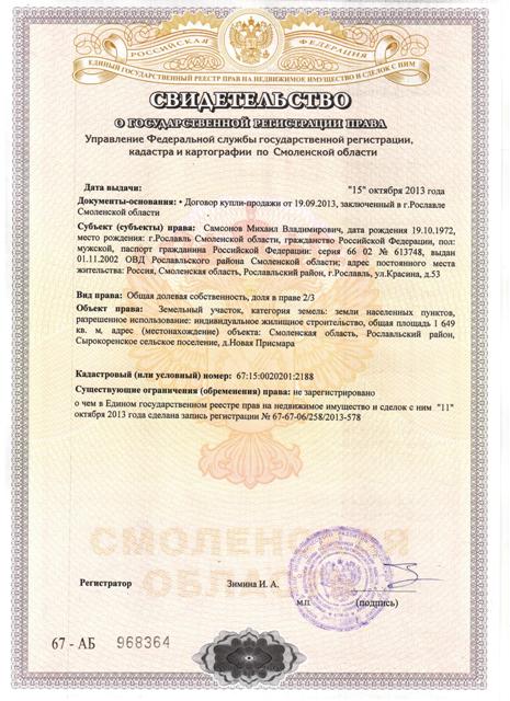 3. Кадастровый паспорт 2 листа(кадастровый паспорт заказывается на свое имя, можно заказать в г. Рославле по адресу: 34 микрорайон, д.3, здание МФЦ: тел: (48134)2-02-03 или 2-17-60, либо в Десногорском филиале СОГБУ МФЦ по адресу: 3 микрорайон, д.16-а (пристройка к дому), тел.: (48153) 7-45-65.